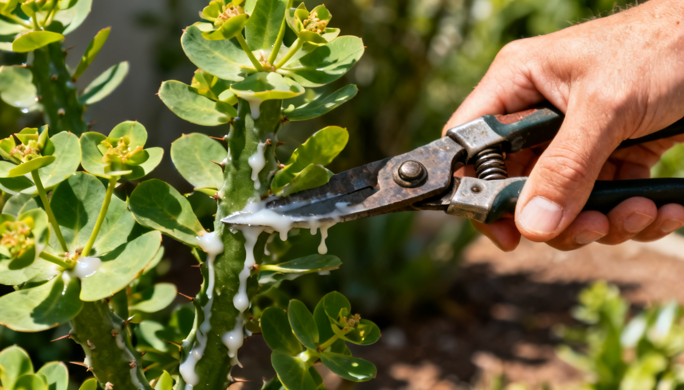 Der weiße Milchsaft der Wolfsmilch ist giftig und kann Hautreizungen, allergische Reaktionen und bei Kontakt mit den Augen schwere Entzündungen verursachen. Daher sind beim Schneiden einige Sicherheitsmaßnahmen unerlässlich: