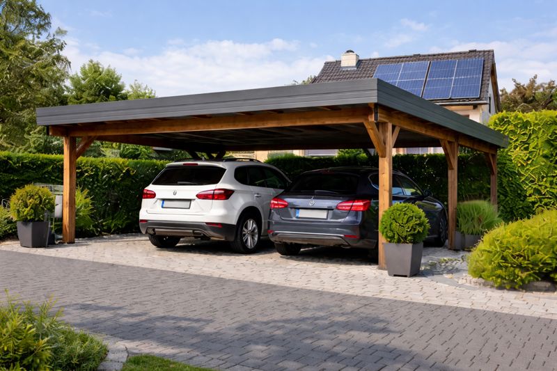 Moderner Doppelcarport aus Holz und Metall mit Platz für zwei Fahrzeuge.