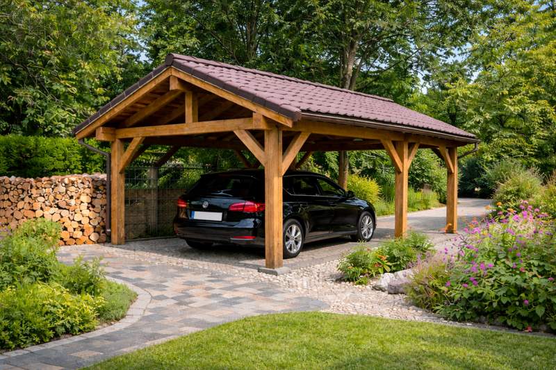 Klassischer Holzcarport mit gepflasterter Einfahrt in einem Garten.